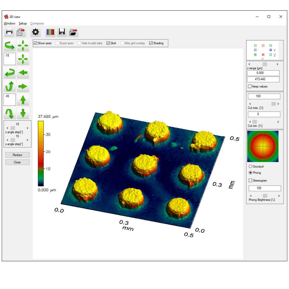 - Filtering and evaluation of profile and surface parameters according to DIN EN ISO 4287 and DIN EN ISO 25178